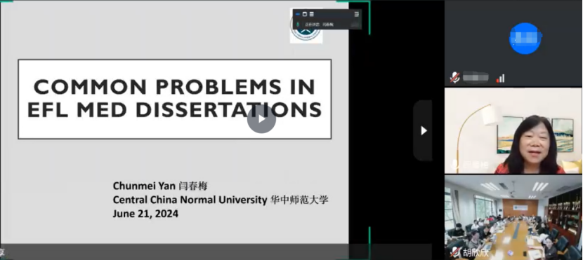 为进一步提高公司公司产品质量,提高硕士研究生学位论文写作水平,6月21日下午,公司特邀中国英汉语比较研究会外语教师教育与发展专业委员会常务理事、华中师范大学外国语学院外语教师教育研究中心主任、博士生导师闫春梅教授针对学科教学(英语)专硕研究生的学位论文选题与写作,作题为“Common problems in EFL MEd dissertations”的在线学术讲座。报告由主管研究生工作的李惠胤副经理主持,suncitygroup太阳集团经理吴岩、教育硕士教学研究中心主任康叶钦、全体学科教学(英语)导师以及全体专硕研究生现场或在线聆听讲座。