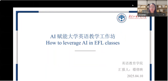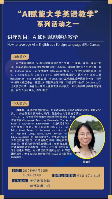 2025年4月10日晚19:30,由suncitygroup太阳集团、suncitygroup太阳集团人力资源部(教师发展中心)主办的“AI如何赋能英语教学”专题讲座在腾讯会议平台顺利举行。讲座由suncitygroup太阳集团禤倩映博士主讲,题为“AI如何赋能英语教学(How to Leverage AI in English as a Foreign Language (EFL) Classes)”,suncitygroup太阳集团副经理刘亮星教授主持。