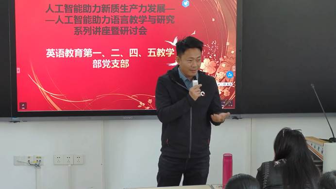 3月20日中午,在校园里木棉花和紫金花的见证下,北校第一教学楼南105报告厅座无虚席,suncitygroup太阳集团“党建引领人工智能赋能教育创新——智能技术助推新时代语言教学与研究高质量发展系列讲座暨研讨会”(第三场)在此隆重举行。研讨会由第四教学部党支部书记周金华主持,来自四个教学部党支部的党员教师及骨干教师齐聚一堂,共同见证人工智能技术与语言教学研究的深度融合。